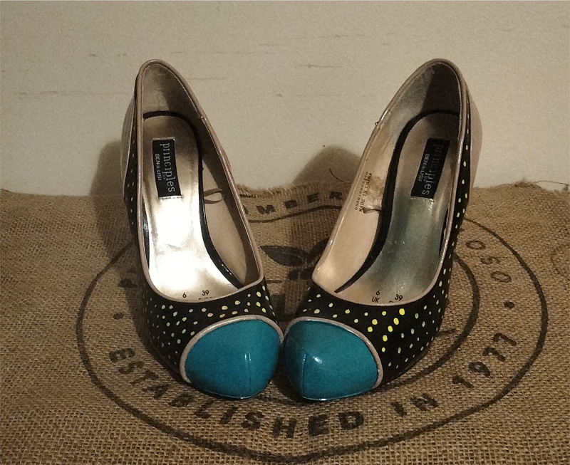 These really are “the tall ones”. Size 8, hand painted uPVC shoes that will dazzle as you much as you do. For wear or display as art work.